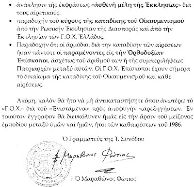 «᾿Εκ τοῦ ἐγγράφου τούτου κατάφωροι γίνονται οἱ γράψαντες, οὐ μόνον ὡς ὀφλισκάνοντες τελείαν ἄγνοιαν τοῦ Κανονικοῦ Δικαίου καὶ τοῦ πνεύματος τῶν θείων καὶ ῾Ιερῶν Κανόνων, δι᾿ ὧν καθορίζονται σαφῶς καὶ κατοχυροῦνται τὰ δίκαια τῆς ᾿Εκκλησίας, τῶν διοικούντων ταύτην ῾Ιεραρχῶν καὶ ἅπαντος τοῦ ὀρθοδόξου χριστεπωνύμου Πληρώματος, ἀλλὰ καὶ ὡς ἀσεβοῦντες πρὸς αὐτὴν τὴν θείαν Χάριν, τὴν ἐνυπάρχουσαν εἰς τὴν ἔννοιαν τῶν θείων Μυστηρίων, δι᾿ ὧν ἁγιάζονται οἱ πιστοί, τῶν ῾Ιερέων χρησιμευόντων, οὐχὶ ὡς ποιητικῶν αἰτίων τῆς ἁγιαστικῆς Χάριτος, ἀλλὰ ὡς μέσον μεταδόσεως ταύτης εἰς τοὺς πιστούς.
